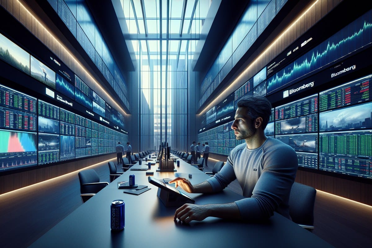 A trader at a Bloomberg terminal refreshing a social media feed on a tablet inside a hedge fund office.