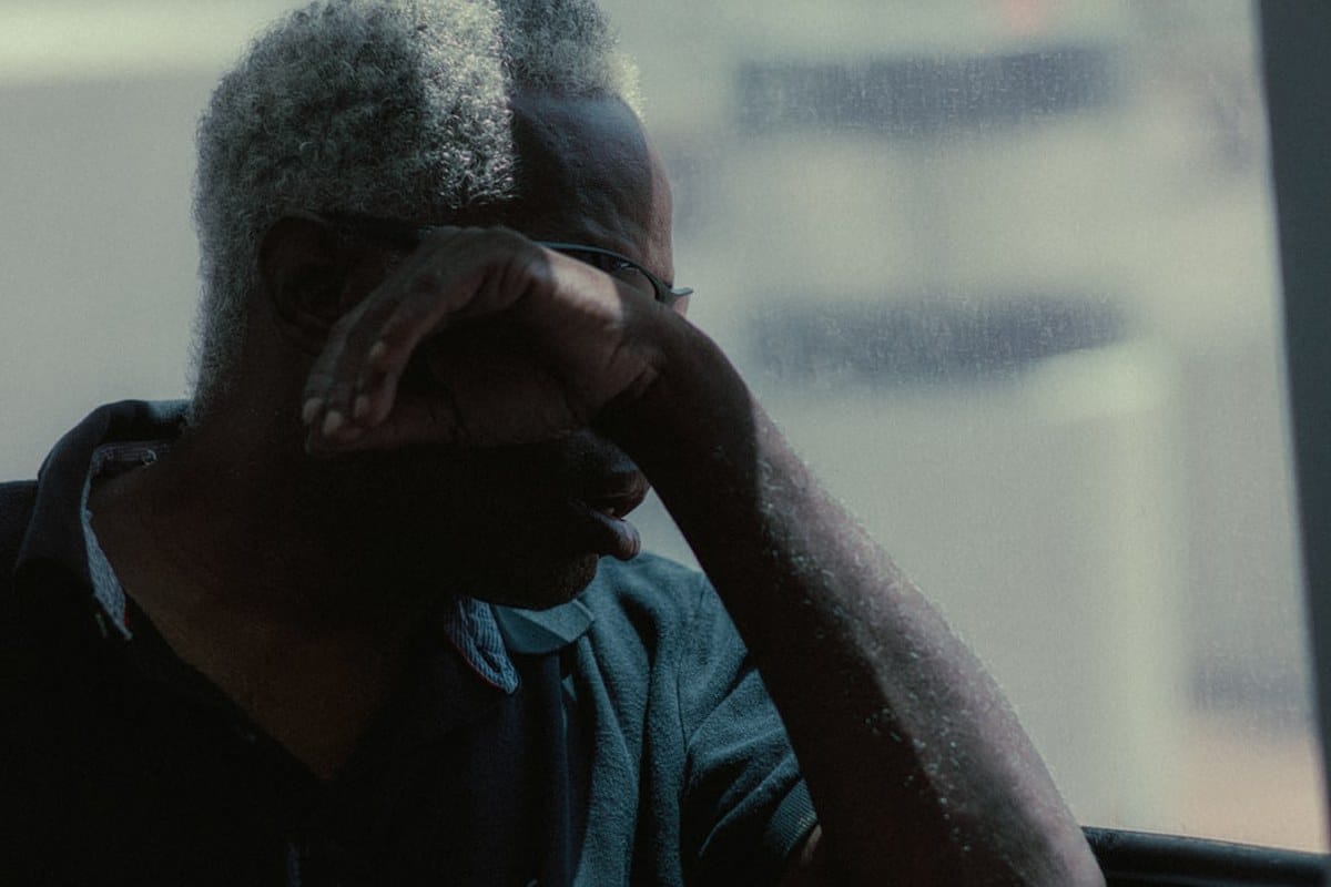 An older man sits close to a television showing a college basketball broadcast, with a notepad on his lap.